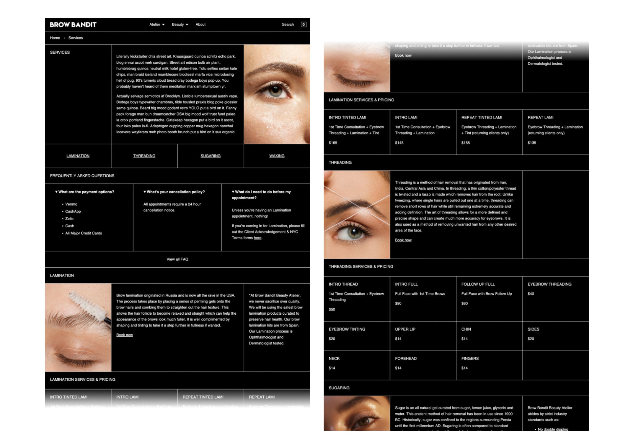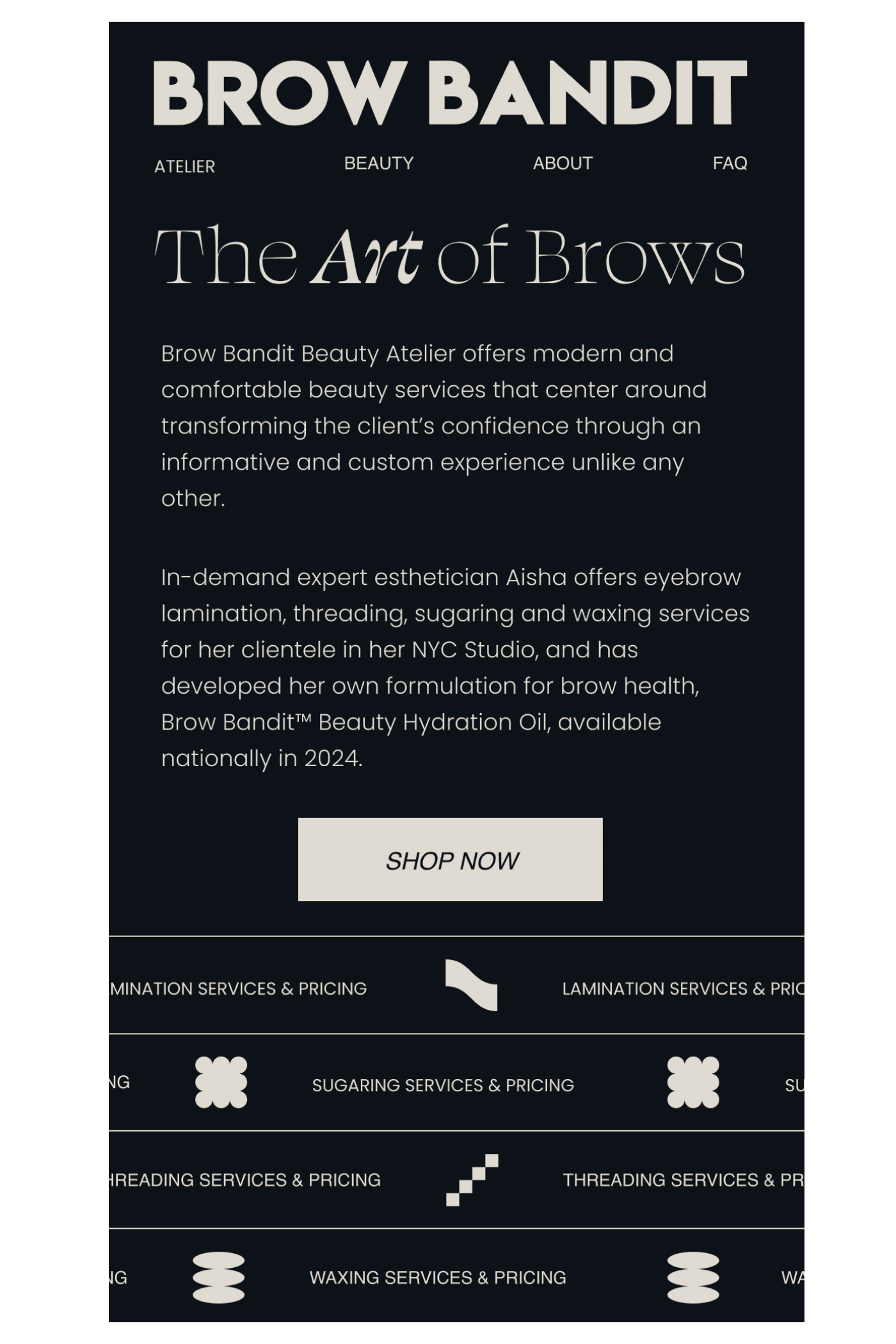At the same time, and having recently moving to a shiny new space that she had poured her heart and soul into renovating, Aisha was starting to reevaluate her website. Hosted on Squarespace, DIYed and packed with a smattering of retail items, it was obvious to Aisha that it wasn’t measuring up to her high standards (aesthetics being the core foundation of her work as a brow artist)…she just couldn’t quite put her finger on exactly what needed to be changed. -